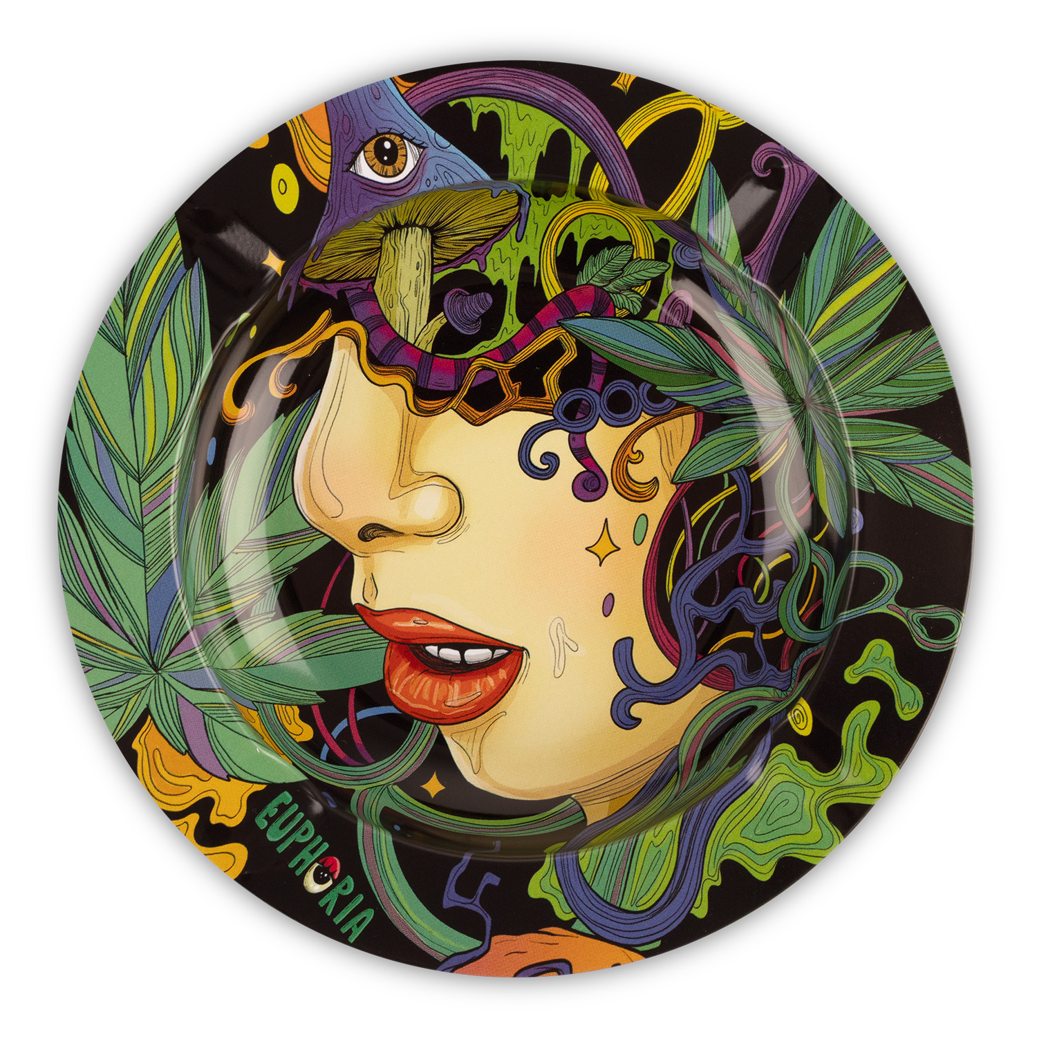 Durable tin-metal ashtrays decorated with signature Euphoria artwork. Lightweight, easy to clean and perfect for everyday use — a practical accessory with a bold designs.