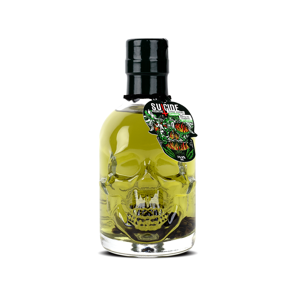Θανάσιμα δυνατό, 100% φυσικό Τσέχικο Αψέντι πωλείται σε μοναδικά μπουκάλια με ανάγλυφα ανθρώπινα κρανία, που παραπέμπουν στην εξαιρετική του δύναμη. Επιπλέον, προστίθενται σπόροι κάνναβης σε κάθε μπουκάλι πριν από την πλήρωση, που όχι μόνο έχουν διακοσμητικό αποτέλεσμα, αλλά και δίνουν στο Αψέντι τη μοναδική του γεύση.