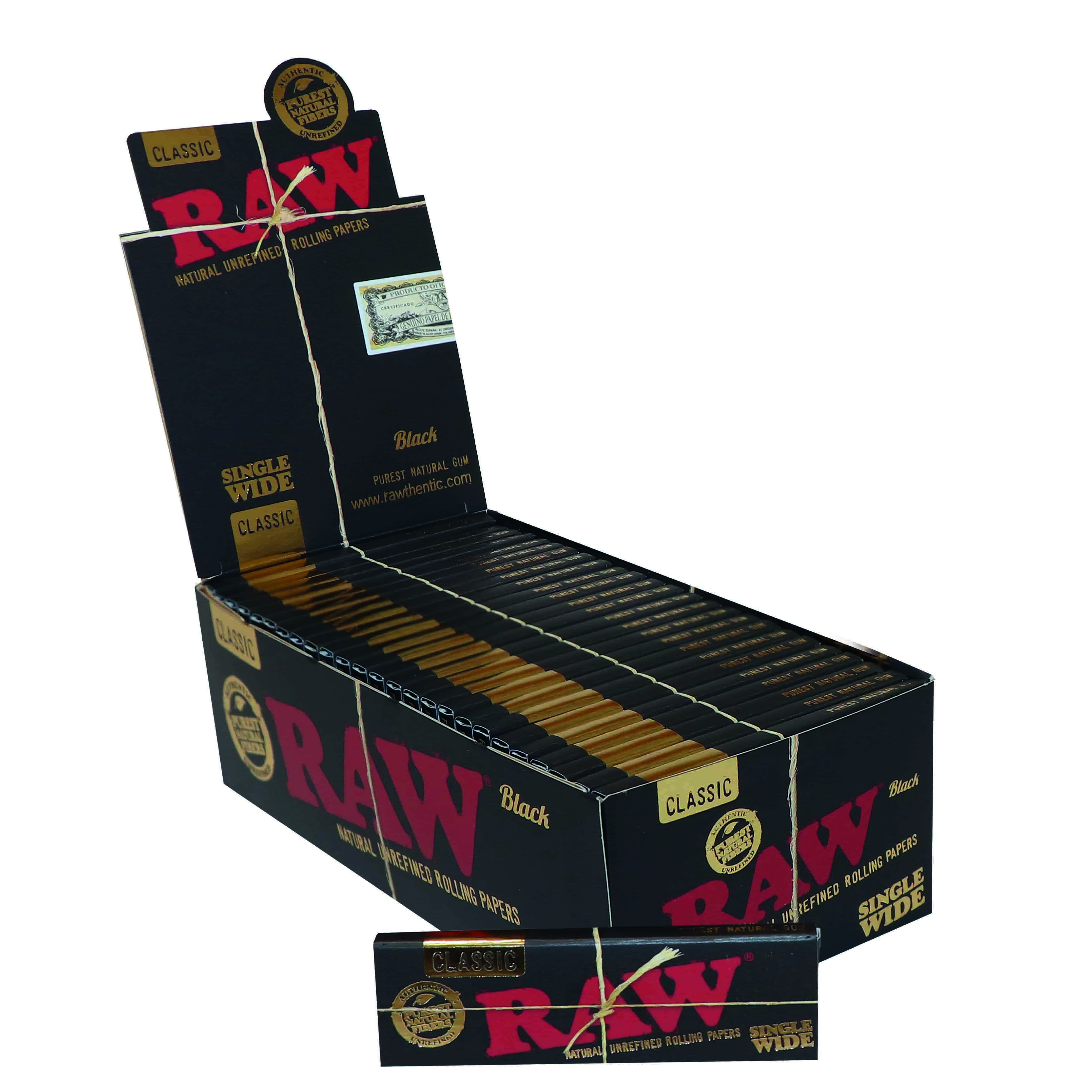 RAW Black Classic Single Wide Rolling Papers. Made from naturally unrefined plants. 50 leaves per pack 50 packets per box (price is per box) Naturally unbleached No additives Made from plants
