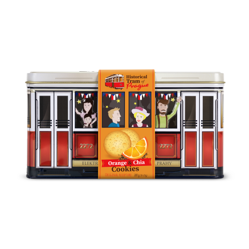 Discover the unique Historical Tram of Prague cookie collection, combining a traditional Prague motif with a delightful taste. This stylish tin, designed as a historic tram, holds crispy cookies with a refreshing blend of orange and chia seeds.