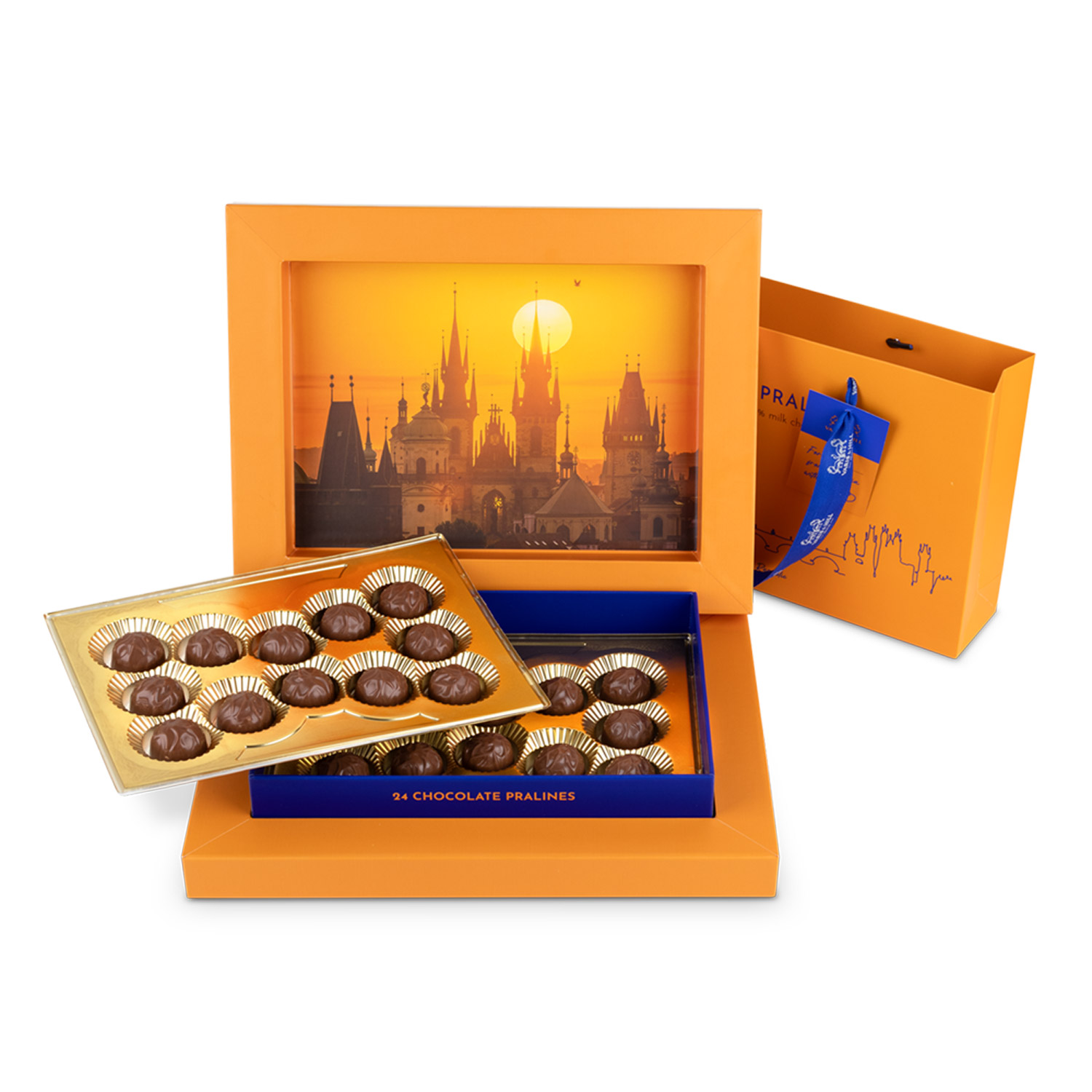 Packaging: The pralines come in a stylish orange gift bag decorated with the iconic silhouette of Prague landmarks, including Prague Castle and Charles Bridge. Blue ribbons and a tag add a luxurious and representative touch. The tag, attached to the ribbon, can be personalized with your own dedication, making this product an even more special gift.